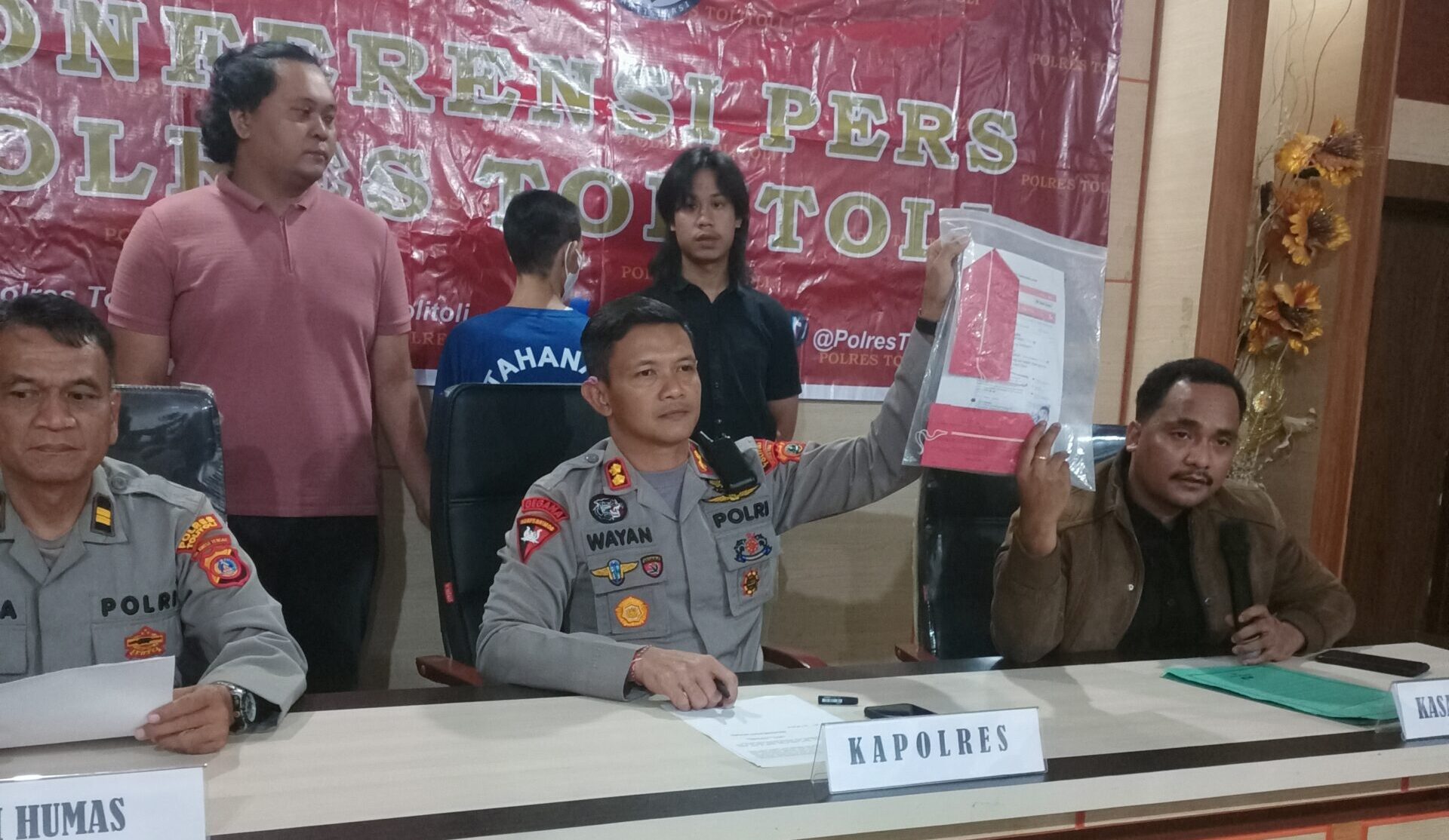 Kapolres Tolitoli AKBP Wayan Wayracana Aryawan, S.I.K., didampingi Kasat Reskrim IPTU Stefi Yohanes Hurlatu, S.Tr.K., M.H. dan Kasi Humas IPTU A. Budi Atmojo, membenarkan penangkapan pelaku.