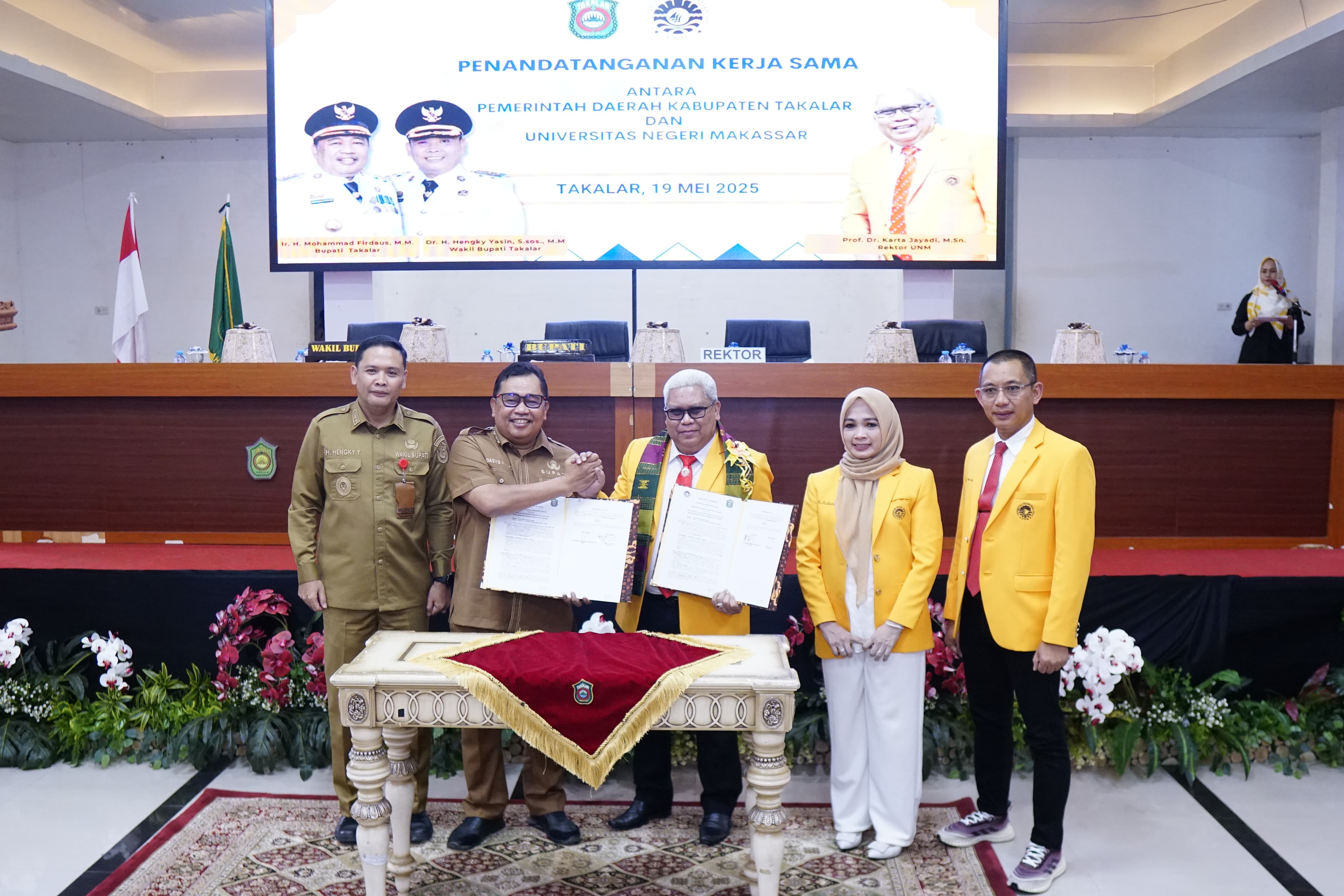 Takalar,Newstv.id—Bupati Takalar Ir. H. Mohammad Firdaus Daeng Manye,.MM didampingi Wakil Bupati Takalar Dr. H. Hengky Yasin,.S.Sos,.MM melakukan Penandatangan Kerjasama dengan Universitas Negeri Makassar (UNM) di Ruang Pola Kantor Bupati Takalar, Senin 19 Mei 2025.