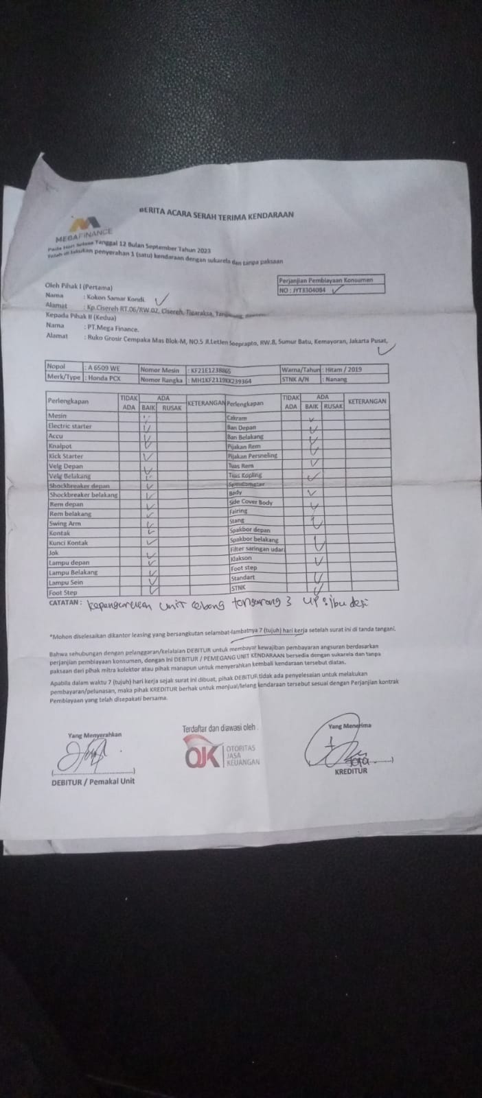 Bahkan Sampai per tanggal 22 September 2023, obyek jaminan (sepeda motor) yang ditarik oleh okunum tersebut pun tidak diterima oleh PT. Mega Finance sehingga kredit atas konsumen tersebut masih aktif.”pungkasnya.