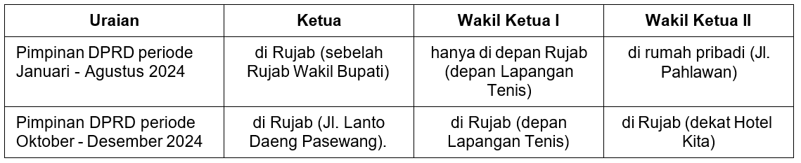 Wakil Ketua II (periode Januari–Agustus 2024) diantar langsung ke rumah pribadi di Jalan Pahlawan, dekat Kantor Dinas Koperasi, karena yang bersangkutan tidak tinggal di rumah jabatan.