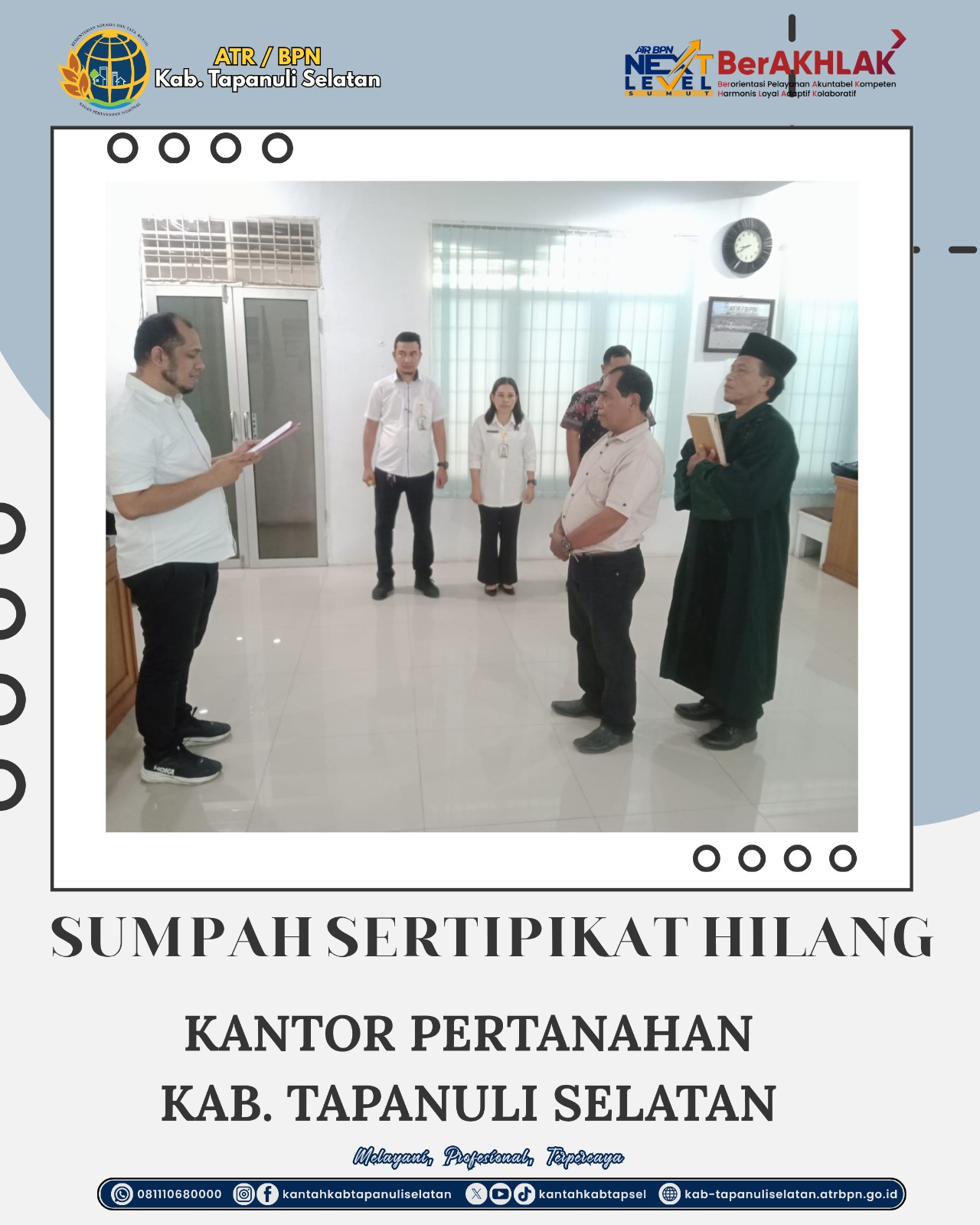 Tapanuli Selatan, NEWSTV.ID — Kantor Pertanahan Kabupaten Tapanuli Selatan kembali menunjukkan komitmennya dalam memberikan pelayanan publik yang profesional, transparan, dan akuntabel melalui pelaksanaan kegiatan pengambilan sumpah atas kehilangan sertipikat tanah, Selasa (07/04/2026).