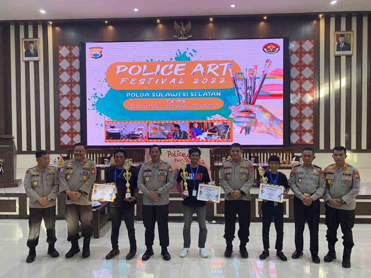 Berikut peraih juara Lomba dalam ajang Police Art Festival 2022 Polda Sulawesi Selatan, Juara 1 Rahmat Hidayat (Polres Jeneponto), Juara 2 M Isal (Polres Bulukumba) dan Juara 3 Nero Ali Zaenal Assajad (Polres Bone).