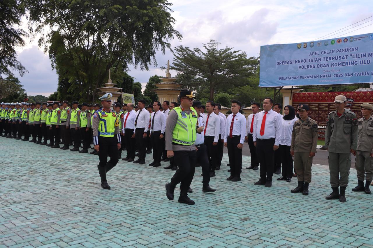 OKU – Polres Ogan Komering Ulu (OKU) menggelar Apel Gabungan dalam rangka Operasi Lilin Musi 2025 di Halaman Apel Mapolres OKU, Jumat (19/12/2025) sekitar pukul 16.00 WIB. Apel ini dilaksanakan sebagai bentuk kesiapan pengamanan perayaan Natal 2025 dan Tahun Baru 2026 di wilayah Kabupaten OKU.