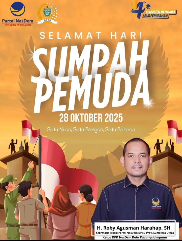 Medan, NEWSTV.ID — Dalam semangat memperingati Hari Sumpah Pemuda ke-97 tahun 2025, Sekretaris Fraksi Partai NasDem DPRD Provinsi Sumatera Utara yang juga Ketua DPD Partai NasDem Kota Padangsidimpuan, H. Roby Agusman Harahap, S.H., menyampaikan pesan inspiratif bagi seluruh generasi muda Indonesia agar menjadikan momentum Sumpah Pemuda sebagai ajang refleksi sekaligus kebangkitan untuk berkontribusi nyata membangun bangsa.