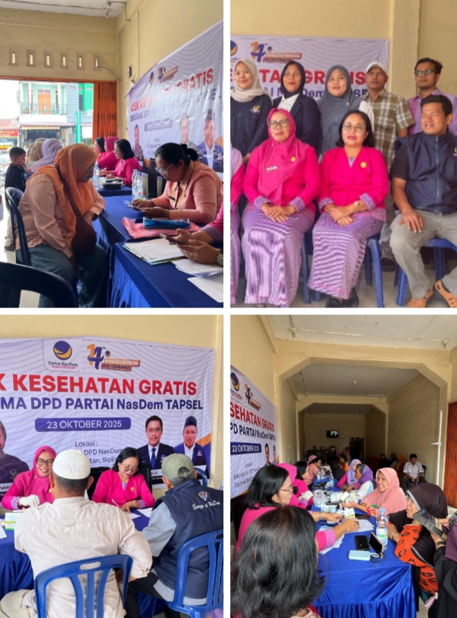 Tapanuli Selatan, NEWSTV.ID – Menyambut Hari Ulang Tahun (HUT) ke-14 Partai NasDem yang jatuh pada November 2025 mendatang, Dewan Pimpinan Daerah (DPD) Partai NasDem Kabupaten Tapanuli Selatan menggelar kegiatan cek kesehatan gratis bagi masyarakat. Kegiatan ini berlangsung di Sekretariat DPD NasDem Tapanuli Selatan, Kecamatan Sipirok, Kamis (23/10/2025).