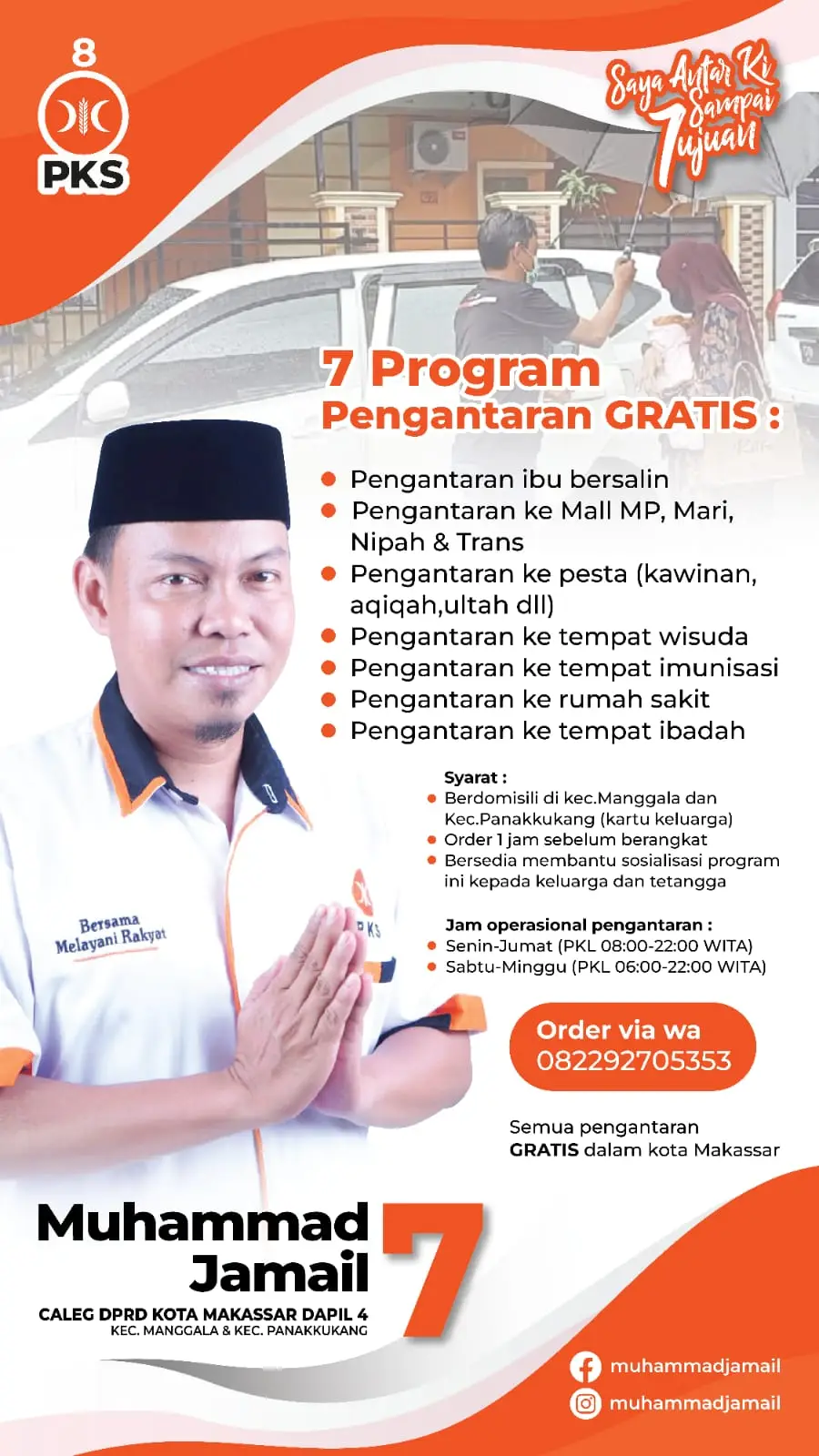 Selain mengantar ke rumah sakit saya juga bisa mengantar ke acara Pengantin, ke Mall dan ke acara apapun yang jelas nya dalam kota Makassar, ” Tutup Muhammad Jamail Caleg dari Partai PKS No.7 ini. (54hru2).